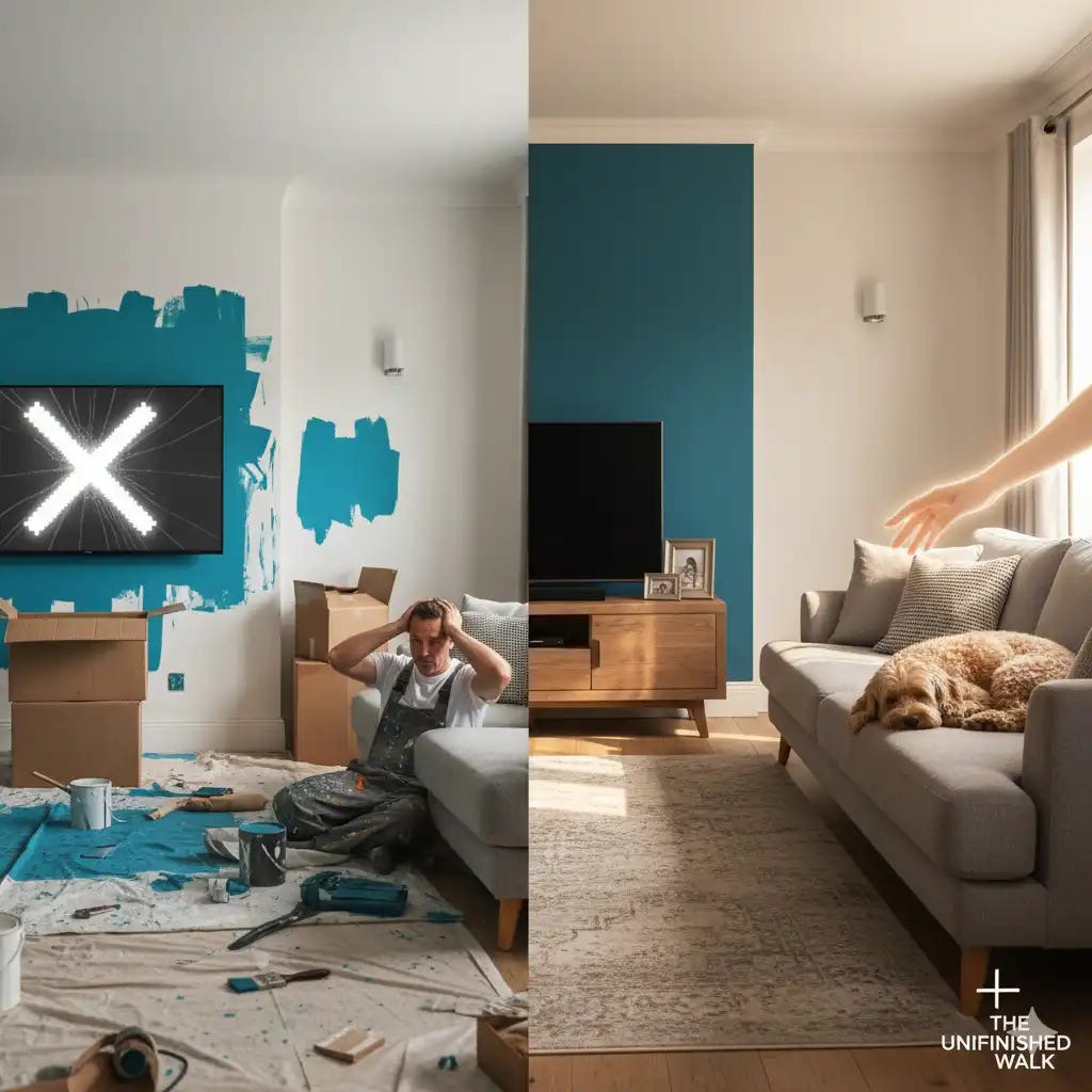 The plan was simple. We’d chosen a beautiful, deep colour, a cross between a teal and a dark blue, for a single feature wall, with the other walls remaining a crisp white. I’d also ordered a new TV unit. Our television was currently mounted on the wall, but we liked the idea of standing it on the unit to free up wall space for pictures and art that would bring more of our personality into the room.